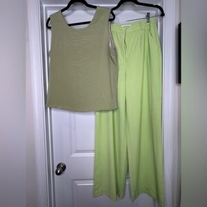 WeWoreWhat Women’s Lime Green Wide Leg Pleated Front Trouser Pant, Sz 6 is in great preowned condition. There is a very small stitch showing on the back of the pant. It is not a hole, it is a different colored thread. It is very difficult to see. Photos are attached. For styling: the last photo are the trousers shown with a silk top. It is sold separately.