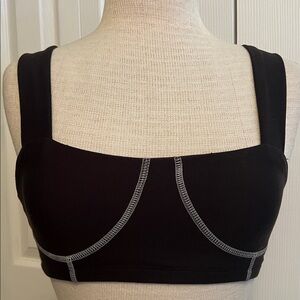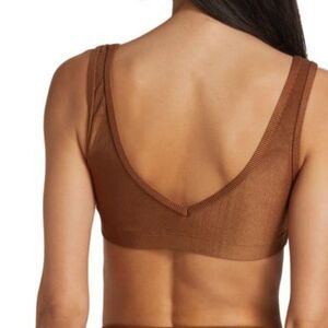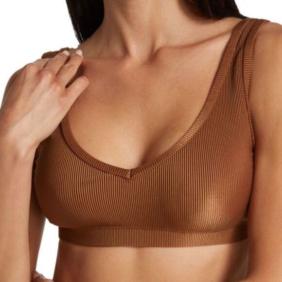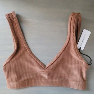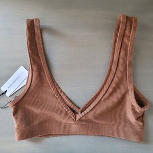 Chic pullover style bra top featuring an underband for support and allover ribbing. V-neck Sleeveless Pullover style Ribbed