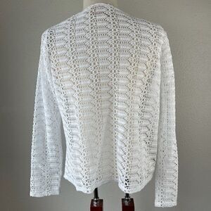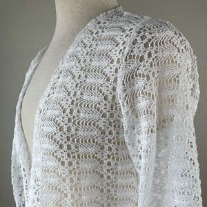 Beautiful and summery white wide lace knit cardigan style top measuring 20 inches armpit to armpit and 23 inches in length.