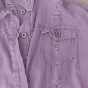 Wear Jeans purple distressed button front jean jacket with multiple pockets. Jacket also has button closures at the sleeve cuffs. Size S. Please see approximate measurements below.