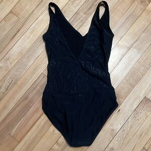 Just like new v-neck/low back leotard. Beautiful swirled design with little decorative buttons. (Listed under Eleve for exposure)