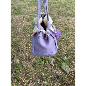 Taffeta and satin create this adorable children’s handbag. Comes complete with a magnet closure and two pockets on the interior, a zip pocket on the front and a shoe compartment. Key chain attached. Color: Lilac/Salmon
