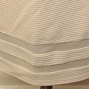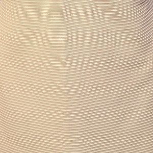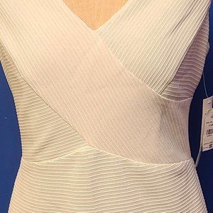 Radiate sophistication in this chic 39" long V-neck bodycon dress that beautifully combines classic elegance with modern flair. Adorned with subtle textured white and silver stripes, this dress exudes an understated charm while offering a unique and eye-catching appearance. The V-neckline adds a touch of allure, framing the neckline gracefully. What sets this dress apart is its exquisite double mesh detail at the hem, a distinct feature that adds an element of intrigue and elevates the overall look. Effortlessly blending sophistication with a contemporary edge, this dress is a statement piece, perfect for those seeking both style and individuality.