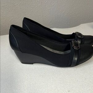 These chic black flats from wear ever feature a sleek design with a decorative silver buckle across the front. Crafted for comfort and style, they are perfect for professional settings or formal occasions.