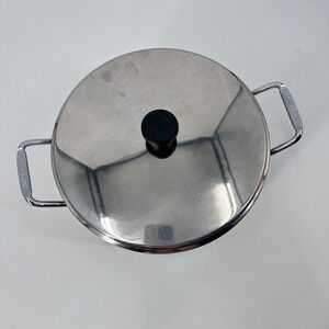 Vintage WearEver stock pot, a durable and versatile addition to any kitchen. This cookware features riveted loop handles on either side, along with a snug-fitting lid with a black knob, making it ideal for a range of cooking tasks. The pot is constructed from stainless steel with an aluminum core and has an 8-quart capacity. While showing signs of wear consistent with age and use, including some marks on the exterior and interior, it remains fully functional and ready to serve in your culinary endeavors.