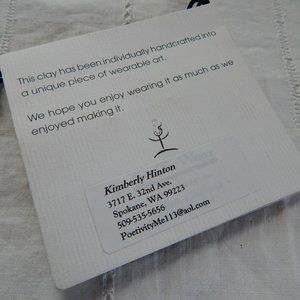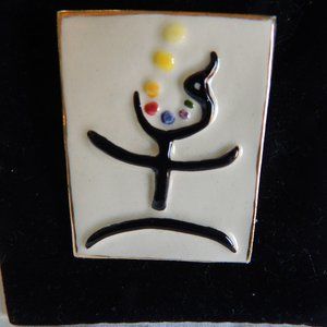 This is an original pin made of fired clay and glazed by artist Kimberly Hinton. It comes attached to a black gift pouch and the original card. It is a unique piece of wearable art for those that appreciate handcrafted items. The pin is trimmed in 22K gold with the logo on a cream background. It measures 1 3/8 x 1 7/8 and was made in Spokane, Washington, circa 1990's. It has never been worn.