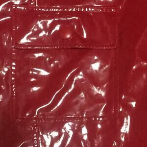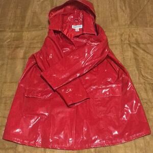 Long Sleeve Red Fully Lined Hooded Rain Coat. Detachable Hood. Covered Buttons. Chest 26” and Length 34”. Item R