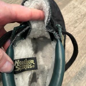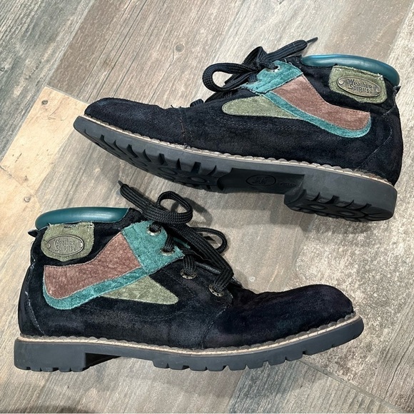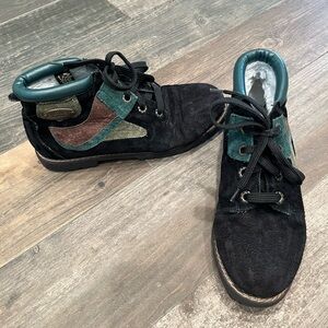 This is a rare find!!! Black suede with greens & brown patchwork. Metal logo plate. Lined in Sherpa. Gently used and in great used condition.