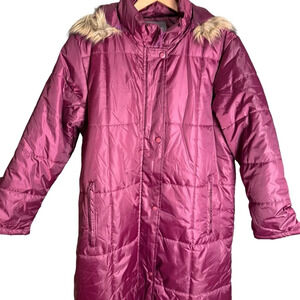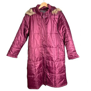 Stay warm and stylish with this beautiful cranberry puffer coat from Totes. The long parka features a quilted design with a faux fur trim hood, full zip closure, and button accents. The coat is made of polyester and poly nylon fabric, with a polyester lining material and insulation material.