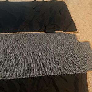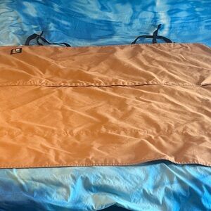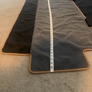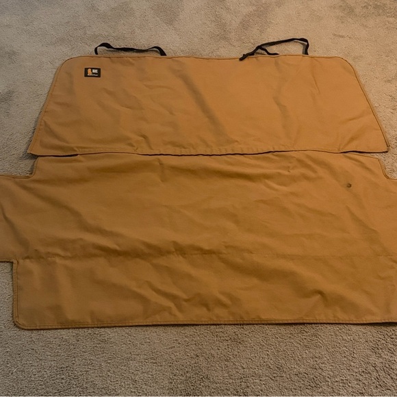 Measurements in pictures. Safeguards your vehicle’s seats against spills and other damage. Nylon inner lining with poly cotton twill fabric material. Water resistant coating. Machine washable. Straps secure around headrest. One small mark shown in pictures.