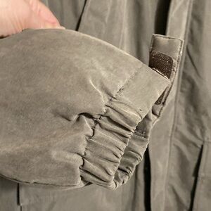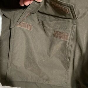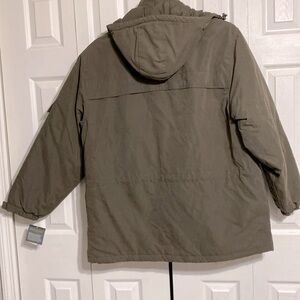 Acrylic polyester nylon thick winter jacket. Quilted & flannel lining. Removable hood with Velcro closure. Zipper front and snaps. Velcro to tighten sleeve cuffs. Toggles to tighten at waist. Inside zipper pocket. 4 front pockets with Velcro close. Removable hood. Approximate Measurements Laying flat: pit to pit 25” - shoulder to hem 31” - sleeves 25”. Preowned good with tag condition please check all pictures.
