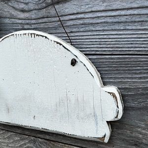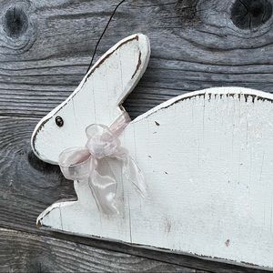 Cute weathered wood rabbit cut from 1/2” plywood. Painted with a distressed look, use indoors or out.