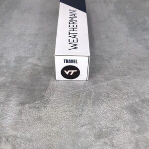 WEATHERMAN Travel Umbrella Virginia Tech. MSRP $69. VT logo on black background. New with tag/in box condition. Can withstand winds up to 55 mph. Automatic open touch button, manual close. Closed length (when collapsed) measures 12 inches. Open measures 38 inches tip to tip in diameter with a 42 inch arc. Wrist strap, reflective trim for visibility in the dark also great for sun shade for a day at a parade, park, or theme park. Storage sleeve included.