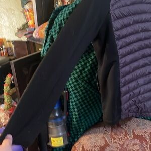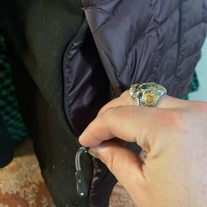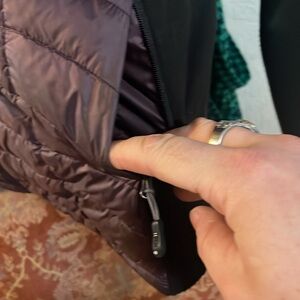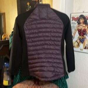 A zip up puffer jacket color purple and black 2 zip up side pockets and 2 inside pockets on both sides