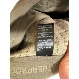 These mens waterproof pants are size 36x34 Long stretch, they are beige, a deep khaki. 60% cotton, 36% nylon, 4% spandex. Thank you for checking out my listing. Be sure to check out the rest of my store.