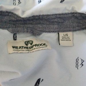 Weatherproof brand. Pastel blue button up shirt. Boats pattern. No fading nor tears. Size large. Excellent condition.