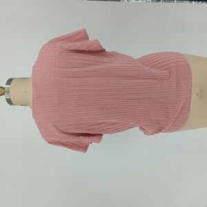 Stylish pink knit top. Features a button-up front. Short sleeves and V-neck design.