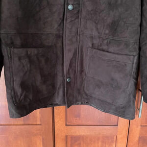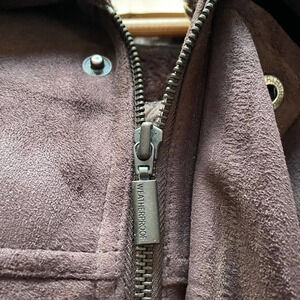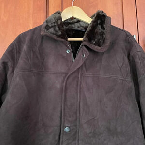 Brown faux suede coat with a faux fur lining from Weatherproof. Features front and inside pockets and a zip and snap closure.