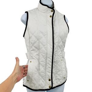 Weatherproof lightweight puffer vest.  Cream color with brown trim.  Gold snap hardware with zipper closure.  2 slip in side pockets.  Back cinch adjustable snaps.