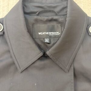 Weatherproof Garment Company Black Double Breasted Trench Rain Coat Size Medium. In like new condition (missing waist belt). Double breasted buttons closure. Two front pockets. Collar detail