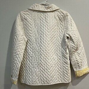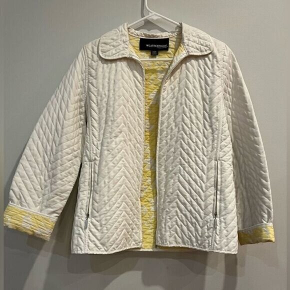 Gently used, looks like new after a quick wash! This lightweight quilted jacket from Weatherproof Garment Company features a crisp white exterior with a bold yellow-patterned interior for a fun, stylish twist. Full zip with functional pockets makes it perfect for layering anytime—running errands, weekend outings, or travel. Classic silhouette meets casual flair for effortless, versatile wear.