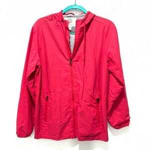 Weatherproof, lightweight hooded rain jacket. It is stated to be water-resistant, made of polyester with a smooth PU (polyurethane) layer and taffeta lining to provide a barrier from chilly air and rain. It is suitable for wear in winter, fall, and spring seasons.