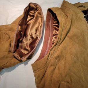 Weatherproof Jacket/Vest with a suede feel on the outside and silk feeling interior but its 100% Polyester. It has removable zippered sleeves and you cannot tell when they're attached or not. It is a light brown color and Size Medium