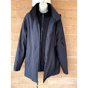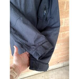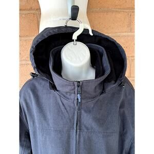 Weatherproof medium weight winter jacket with zip-detachable hood. Heather gray double zip front with high collar neck and adjustable wrists to keep the cold out. Zip front pockets, left arm zip pocket and inside pocket. Women's size medium. Good condition.