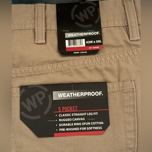 NWT Weatherproof Men's Khaki Jeans in size 42 with a straight fit. Made of 100% cotton denim in beige color. Features a 5-pocket design with button and zipper closures. The waist size is 42 inches and inseam is 30 inches. Machine washable for easy care. Suitable for all seasons, these jeans offer comfort and style with a classic look.