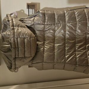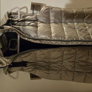 Stylish purple/ silver metallic puffer vest. Features a sleek design. Perfect for layering.