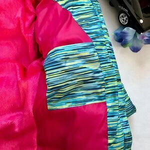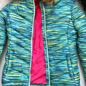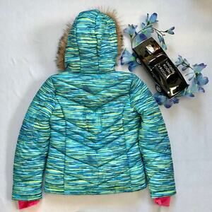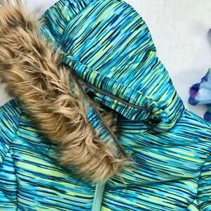 NWOT. Puffer Jacket for Girls Size L (12). Multicolor with baby blue zipper and pink faux fur interior lining, non removable hood with detachable faux fur trim as shown in pic, 2 front pockets with buttons for closure, 1 left side interior pocket. There are no size/care tags. Please see measurements for best sizing. I am approximating is a Size Large based on measurements. Pictures are part of description.