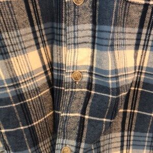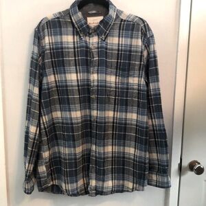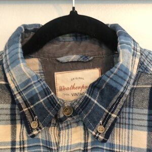 Weatherproof Original Vintage Plaid Long Sleeve Button Down Shirt Size Large. Only worn a couple times and in great condition. Shirt colors are dark blue, light blue with white. 100% cotton, extra buttons on interior tag