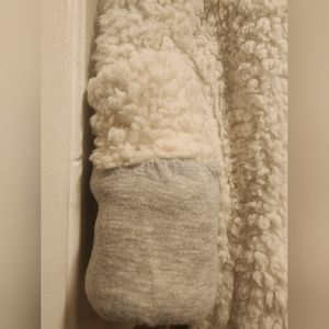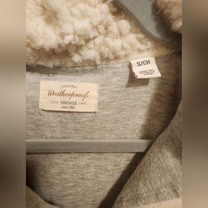 SIZE SMALL. The coolest thing about this off white/cream colored sherpa sweatshirt is the material on the inside (see sleeve pic in photo section). that's the material that makes this sweatshirt "weather proof." both interior or exterior are soft and clean. Hardly warn.