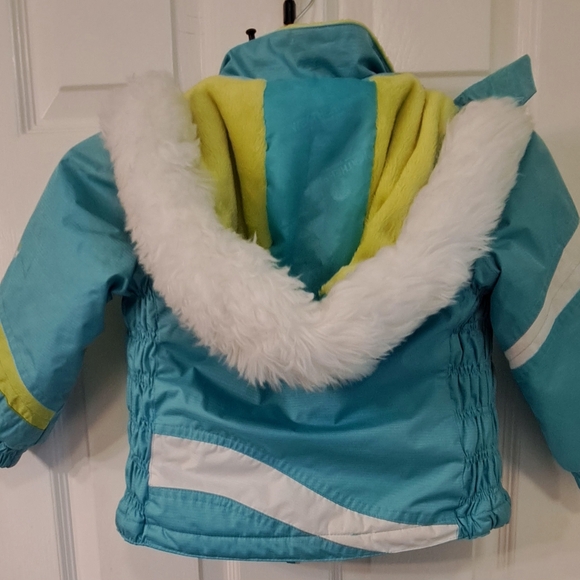 EUC 3T Vibrant puffer jacket with teal and lime accents. Designed for warmth and style.