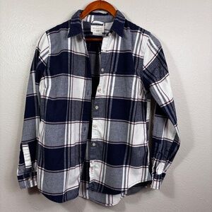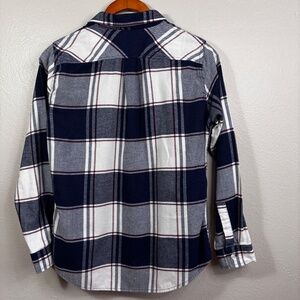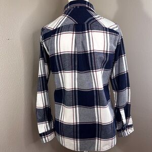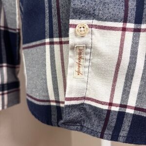 Quality button down flannel shirt from Weatherproof in vintage comfort stretch. Rounded hem. Relaxed fit. Burgundy, white, and navy blue plaid pattern. In good condition with no holes or tears, but it is worn in with some pilling that is expected with flannel. This is your new favorite flannel shirt! Comes from a smoke-free home.
