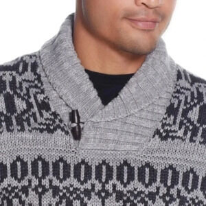 Nice preowned condition, no flaws to note. Shaw collar with button closure. Navy fair isle pattern on gray. Great winter/holiday sweater!