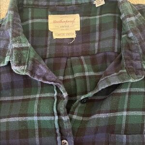 Green and Blue flannel style button up shirt. Women’s cut. Fully functional buttons with a front pocket.