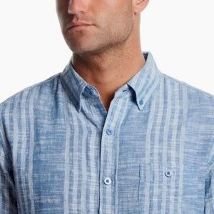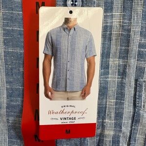 Weatherproof Vintage Men’s Linen/Cotton Short Sleeve Woven Shirt, Blue Stripes, Medium, NWT New With Tags Measurements are below and in photos. Button-Down Collar Button Front Curved Hem Regular Fit Left chest pocket with button closure Box pleat at back 55% Linen, 45% Cotton Lightweight Machine washable, tumble dry low Item #1573805 Smoke free and pet free home. Measurements are taken laying flat and are approximate (see photos). Chest: 21.75 inches Length (from back center collar seam): 30 inches