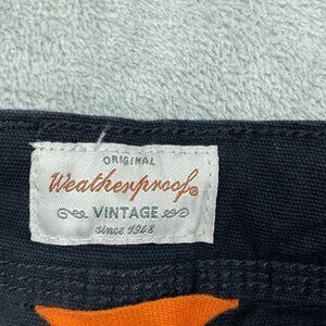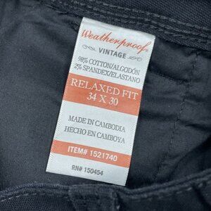 Relaxed-fit black Weatherproof Vintage pants made from 98% cotton and 2% spandex for comfort. Features belt loops, rear pockets, and durable construction. Waist: 34"; Inseam: 30".