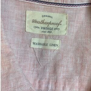 Stay cool and stylish with this Weatherproof Vintage short sleeve button-up shirt in size XL. Made from a lightweight, breathable washable linen blend, this shirt is perfect for warm weather and casual occasions. It features a soft pink woven fabric with subtle texture, a classic button-down collar, a front chest pocket, and white buttons. A relaxed fit makes it ideal for everyday wear or vacation style.