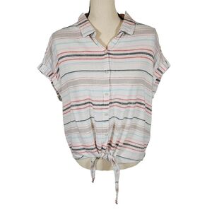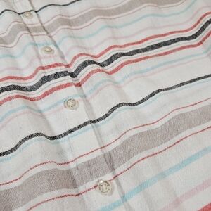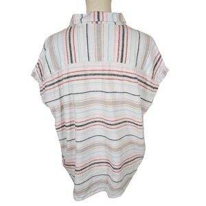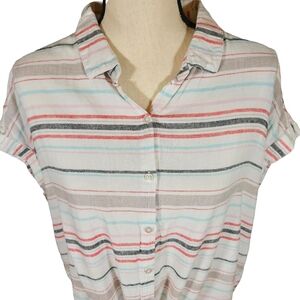 Great Condition, Linen/Viscose Blend Makes This Top Super Lightweight And Breathable, Full Button Closure, Tie Front At Bottem Hem, Collared Neckline, Capped/Dolman Sleeves That Have Sewn Cuffed Hems, Stripes Are Red/Pink/Grey/Tan/Blue