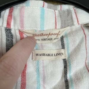 Women’s washable linen button up shirt by Weatherproof Vintage. This white top has multicolored stripes, short sleeves, and a tie front. It is a linen and viscose blend.