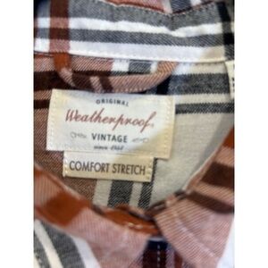 Elevate your wardrobe with this vintage Weatherproof flannel shirt, perfect for any stylish woman. The brown and white plaid pattern adds a classic touch to this long-sleeved collared shirt, while the button closure and stretchy material ensure a comfortable fit. Ideal for any occasion, this flannel shirt is made of 78% cotton, 20% polyester, and 2% spandex, making it both durable and fashionable. The flannel fabric type and regular fit add to its timeless appeal, while the Weatherproof brand guarantees quality. Add this statement piece to your collection today!