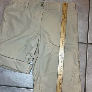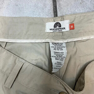 Weatherproof shorts, size 10. Khaki color with adjustable leg length, very lightweight. Button and zipper waist with two pockets in the back. In excellent pre-loved condition. 60% polyester, 40% Nylon.