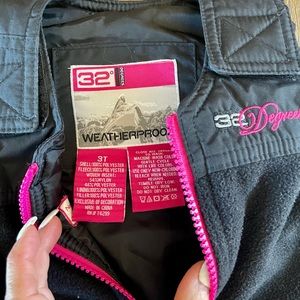 Weatherproof snow bibs in girls size 3T. Full zip front. Ski pass hook. Fleece body with adjustable shoulder straps. Hip pockets. Reinforced knees and boot guard. Snow gator. Worn once in mint condition
