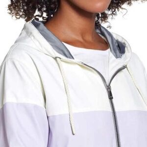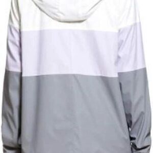 Weatherproof vintage Lightweight, water-resistant hooded windbreaker jacket in purple and white. Features a zip closure, drawstring hood, and pockets. #windbreakerjacket #weatherproof