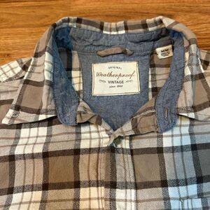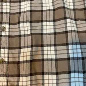 Long sleeve, collared, button up, tan and cream colored flannel. Has front pocket. Size medium. 100% cotton.