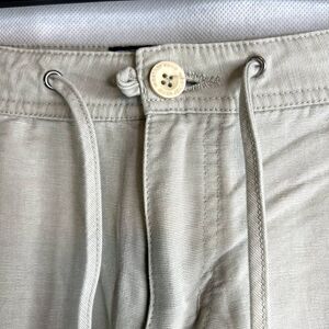 Button/zip front closure, back velcro pockets, drawstring waistband