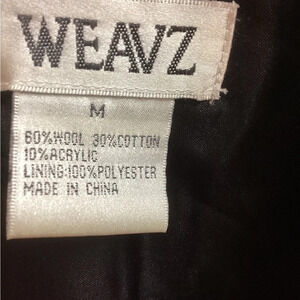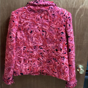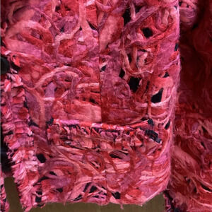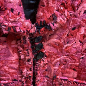 Pink, red and black blazer. Material is textured and looks like wide yarn. 3 loop and button front closure. 2 pockets. Ruffled at neck and cuffs. 17 in across and 22 in shoulder to hem.