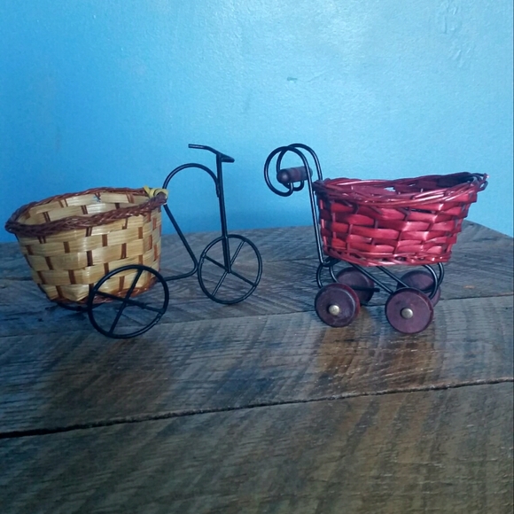 Here we have a vibrant weaved bike and we have a moveable baby carage. Great for decor, collection and for small gifts. Thanks for stopping by. Have a blessed day!
